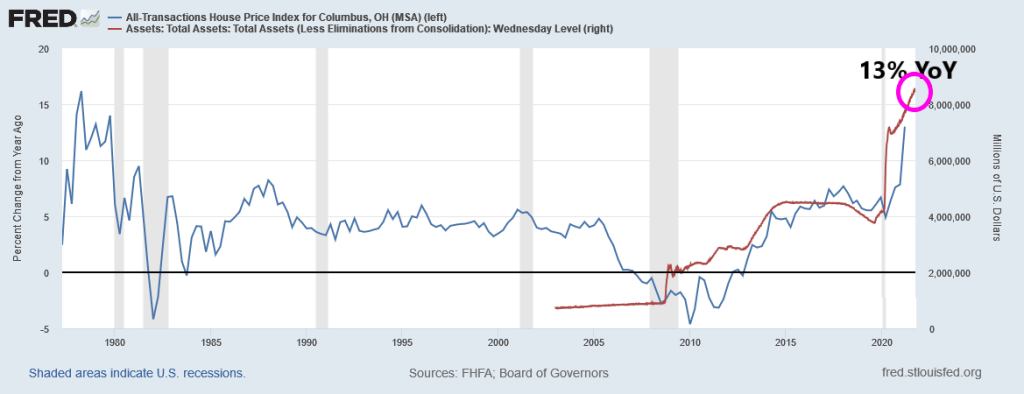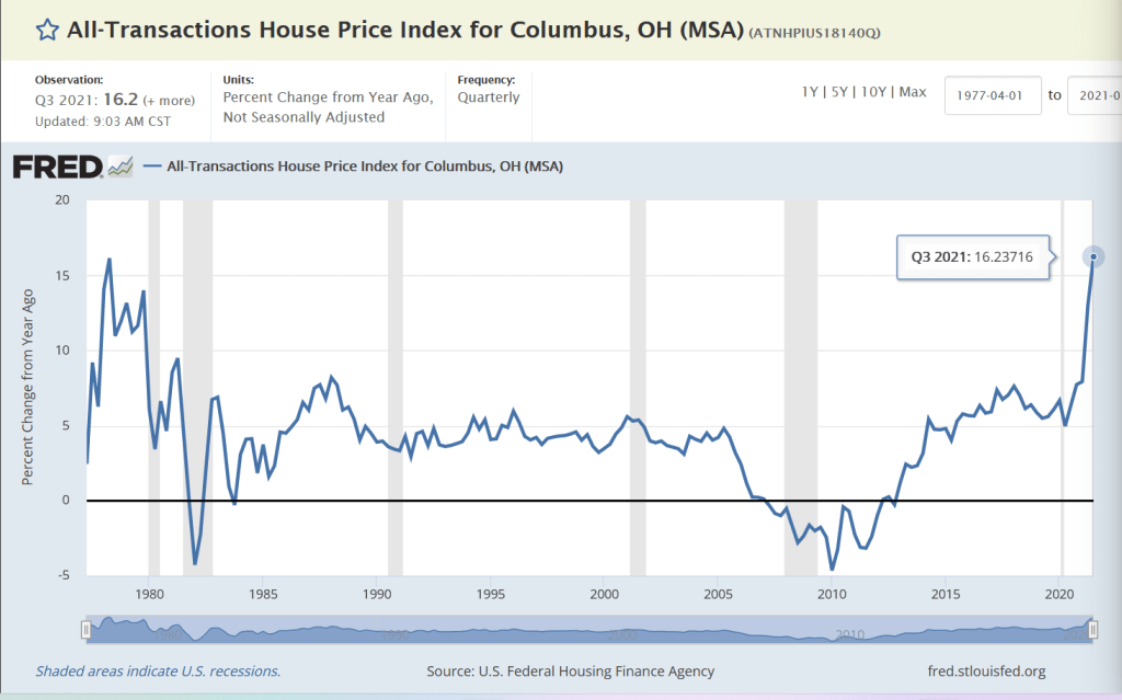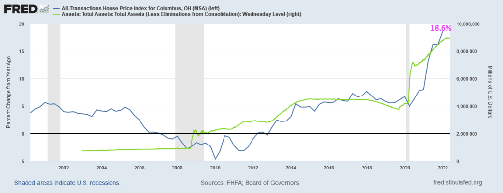 Columbus Ohio is not covered by Case-Shiller in their 20-city index, but the FHFA’s home price index does. And in Q1 2022, home prices grew at a 18.6% YoY clip.