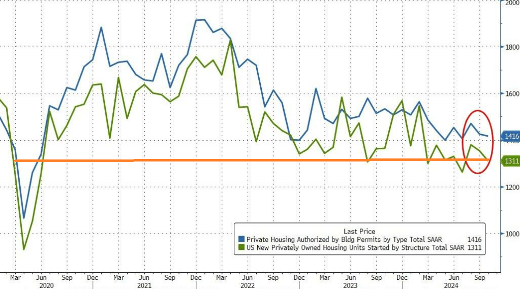 As Biden/Harris approve of Ukraine launching missiles against Russia risking nuclear war, we are witnessing a slow down in the US economy. This time, housing starts and permits.