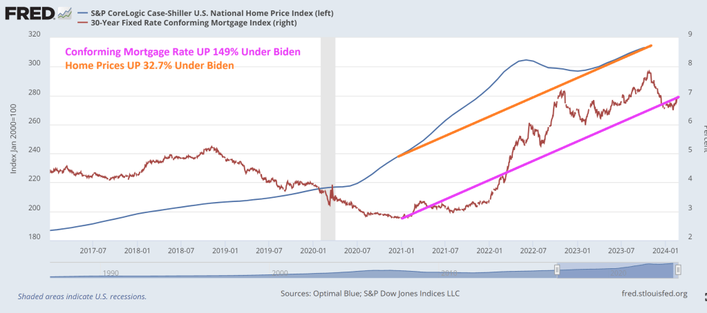 I am not surprised given that the Case-Shiller National home price index has risen by 32.7% under Biden while mortgage rates are up … 149%.