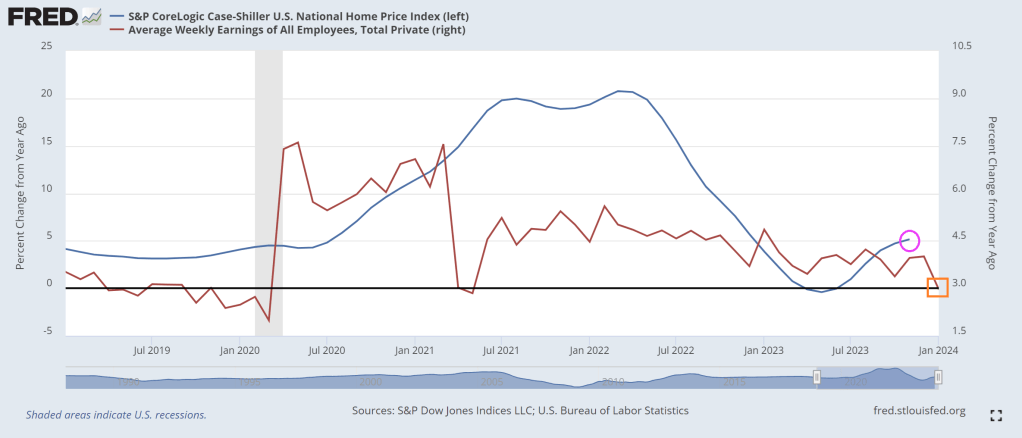 Given the smoothing and heavy lag in the Case-Shiller data, it’s hard to find a causal relationship between prices and mortgage rates…