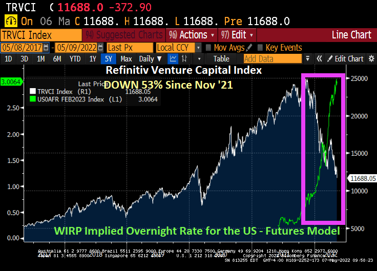 The Refinitiv Venture Capital Index is down 53% since November ’21 as The Fed cranks up interest rates.