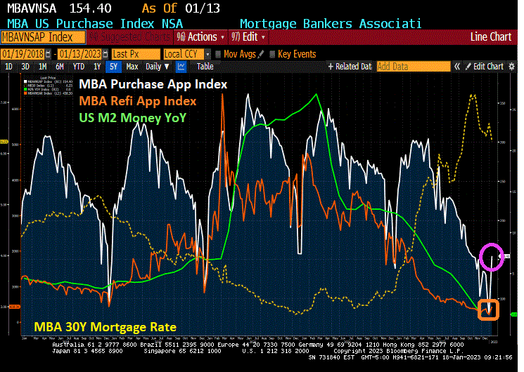 But the all important PCE deflators numbers were down all well. The REAL PCE price index (or deflator) was down to 5.0% YoY in Decmember while REAL CORE price index was down to 4.40%. All this is happening as M2 Money growth has stop spinning (down to -1.3% YoY in December).