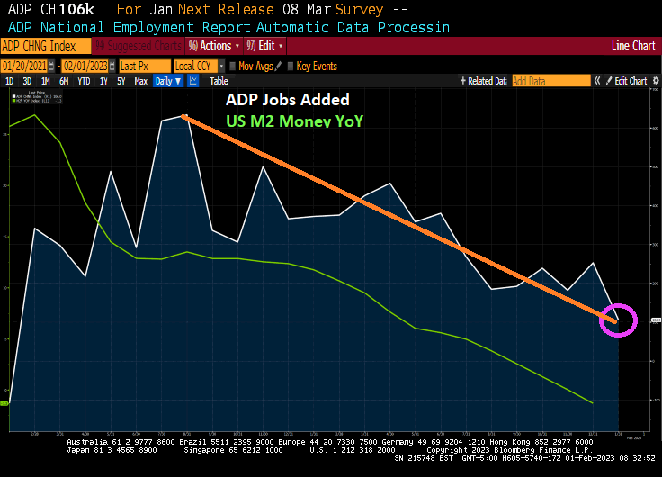 The US economy is slowing down. In fact, ADP jobs added just printed at 106k in January, the lowest reading since August 2021. ADP jobs added follows the slow down of M2 Money growth YoY as The Fed tightens its monetary policy.