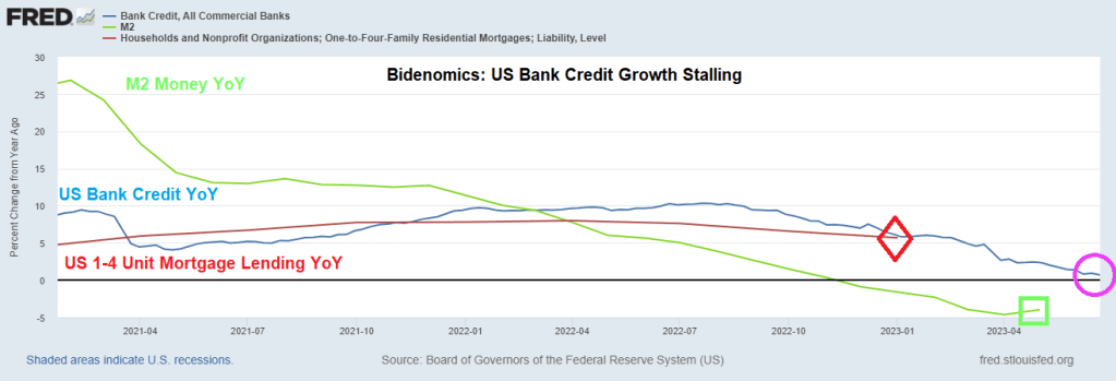 US bank credit year-over-year (YoY) has stalled to a lowly 0.7% rate as M2 Money growth YoY increases slightly to -4%.