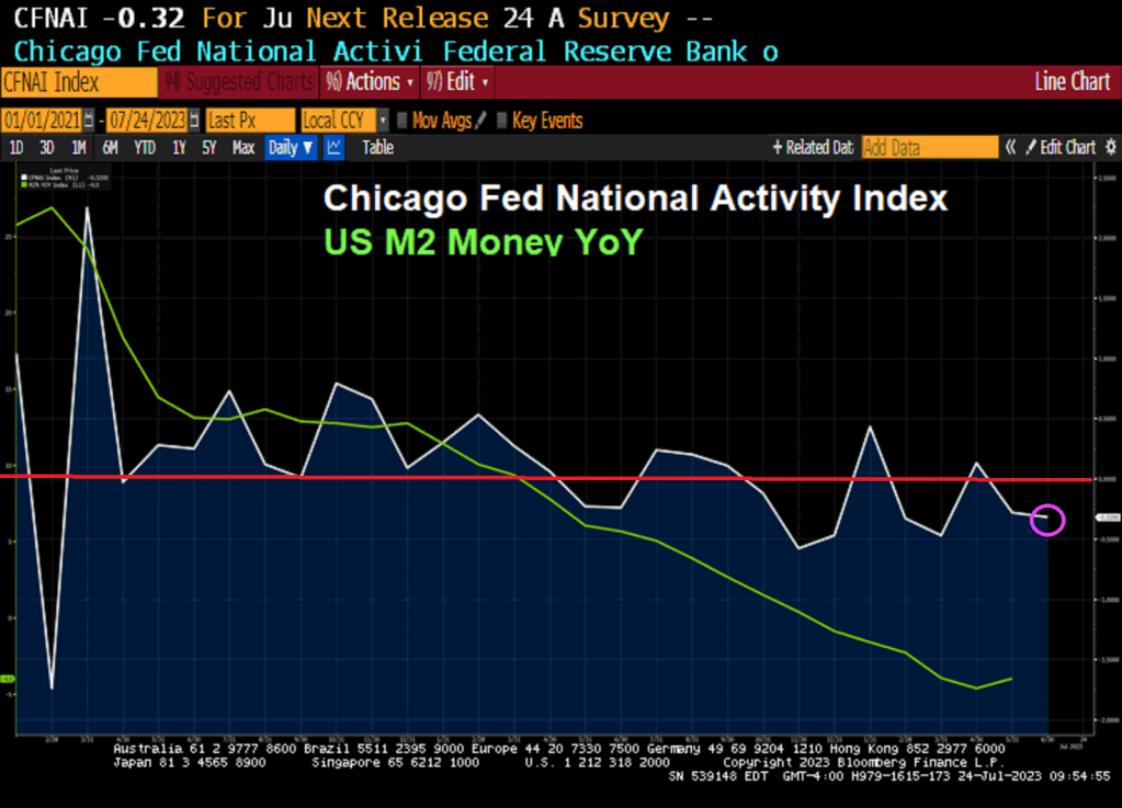 The Chicago Fed’s National Activity index fell to -0.32 in June. That is negative readings for 6 of the last 8 months.