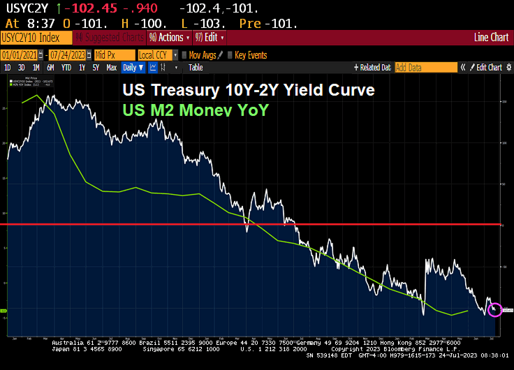 Meanwhile, the US Treasury 10Y-2Y yield curve has inverted to -102.45 as it does prior to a recession. I would love to hear “economist” Jared Bernstein explain that!