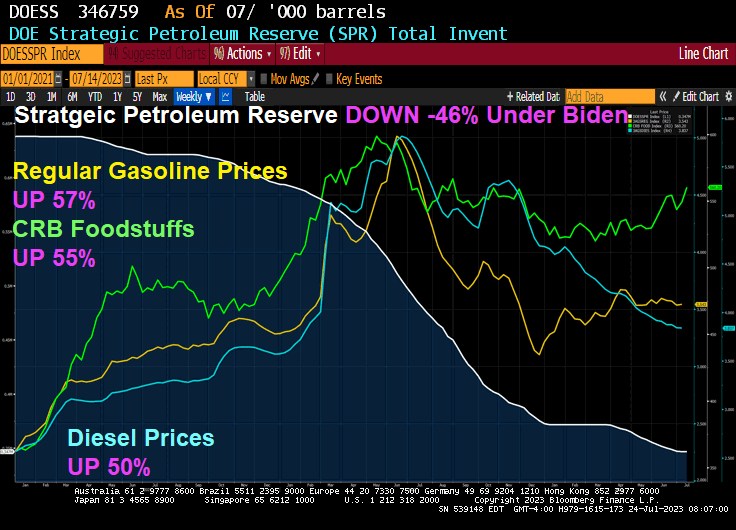 Since January 2021, regular gasoline prices are up 57% under Biden’s and Bernstein’s Reigns of Error. CRB Foodstuffs are up 55% under Clueless Joe and Diesel prices 50% under Bully Biden. Meanwhile, the Strategic Petroleum Reserves is DOWN -46% under Hidin’ Biden.