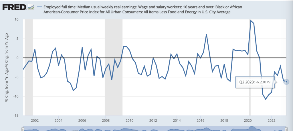 Excuse me Karine. REAL weekly earnings growth remains negative as inflation outpaces weekly earnings growth. As of Q2 2023, REAL median weekly earnings growth is a dismal -3.57% YoY.