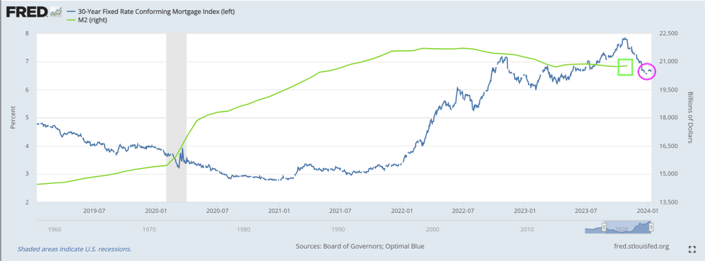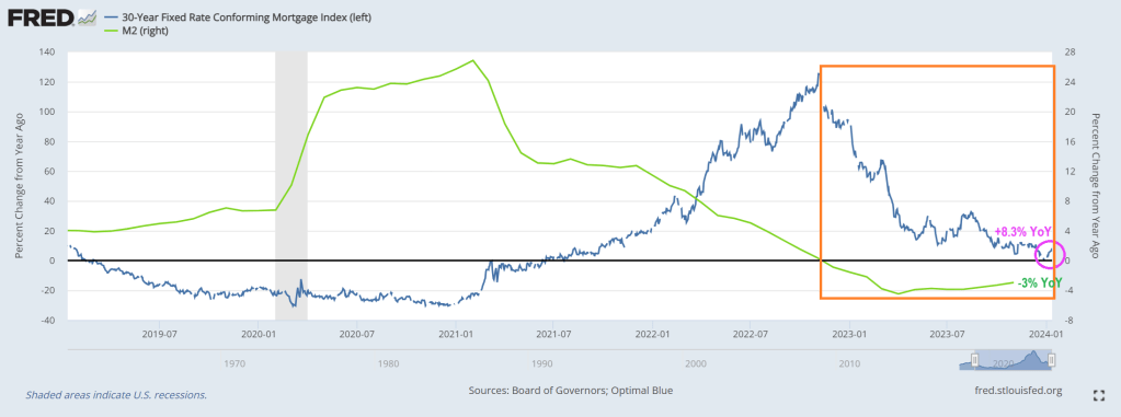 Check out mortgage rate GROWTH (blue line) as M2 Money growth *green line) went negative (orange box).