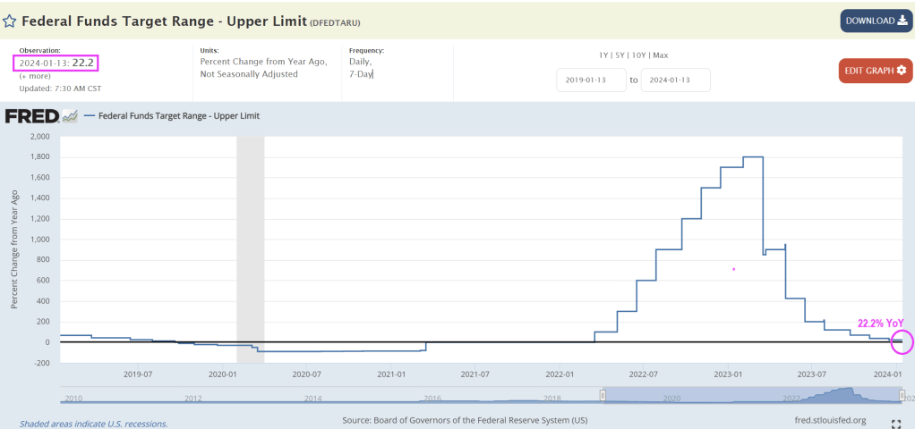 This graph corresponds nicely with this chart of YoY changes in The Fed Funds rate. Which is still rising at a rate of 22.2% year-over-year (YoY).