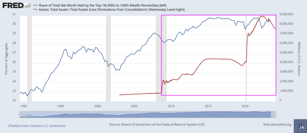 The Fed’s balance sheet has had a similar effect, particularly since the financial crisis of 2007-2008 when The Fed truly became unhinged under Janet Yellen. So of course, Yellen was made Secretary of Treasury, the largest honey pot in the world, so she could continue growing the elites power while minimizing the wealth of all others.