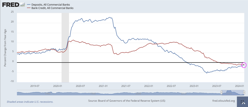 Both bank credit growth year-over-year (YoY) and bank deposit growth (YoY) are NEGATIVE. Covid resulted in massive Federal government stimulus spending (and Federal Reserve hyper stimulus) in 2020, but as the stimulus wears out, so does bank lending and deposits.