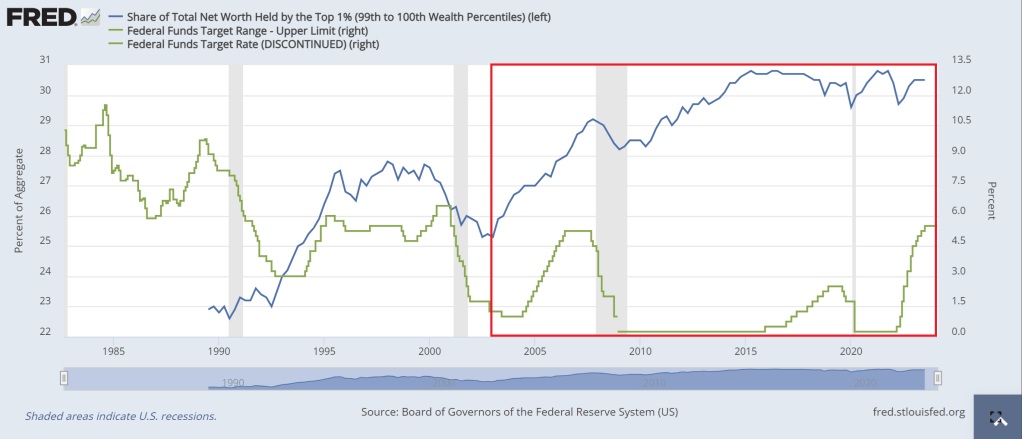 An example of the Sisyphus economy? The top 1% of earners (blue line) have seen an incredible increase in net worth, particularly after Fed Chair Alan Greenspan’s big rate cuts (green line) from 2000 to 2004. Each subsequent rate cuts under Bernanke (2007-2008) and Yellen (who just kept rates too low for too long). The end result? In the red box, the top 1% made out like bandits.