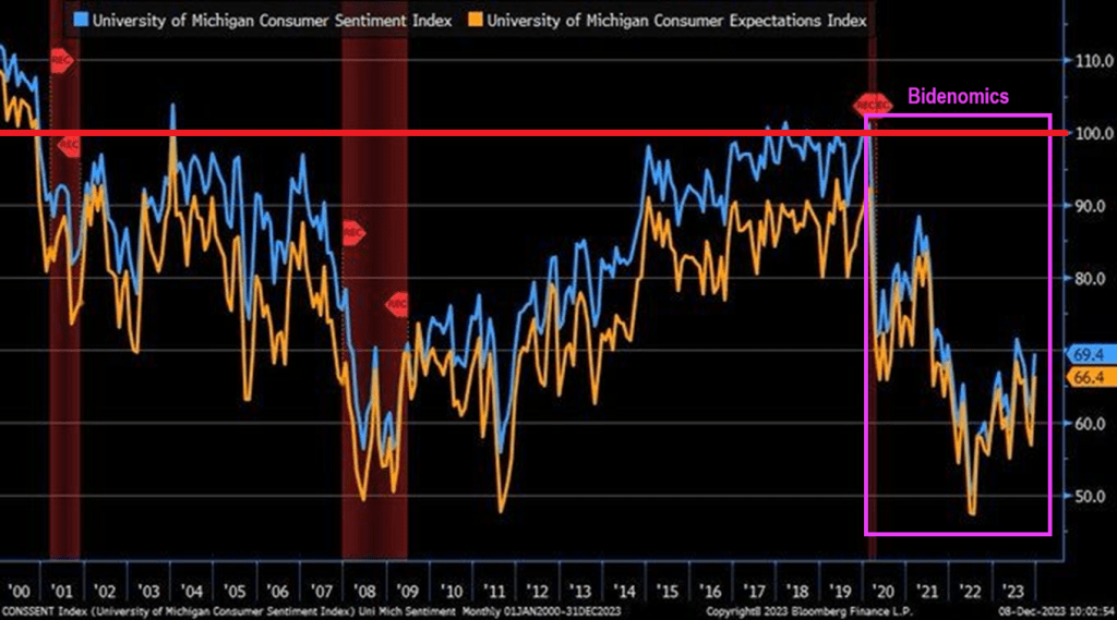 Consumer sentiment is below 70 (100 baseline) under Biden and Bidenomics.