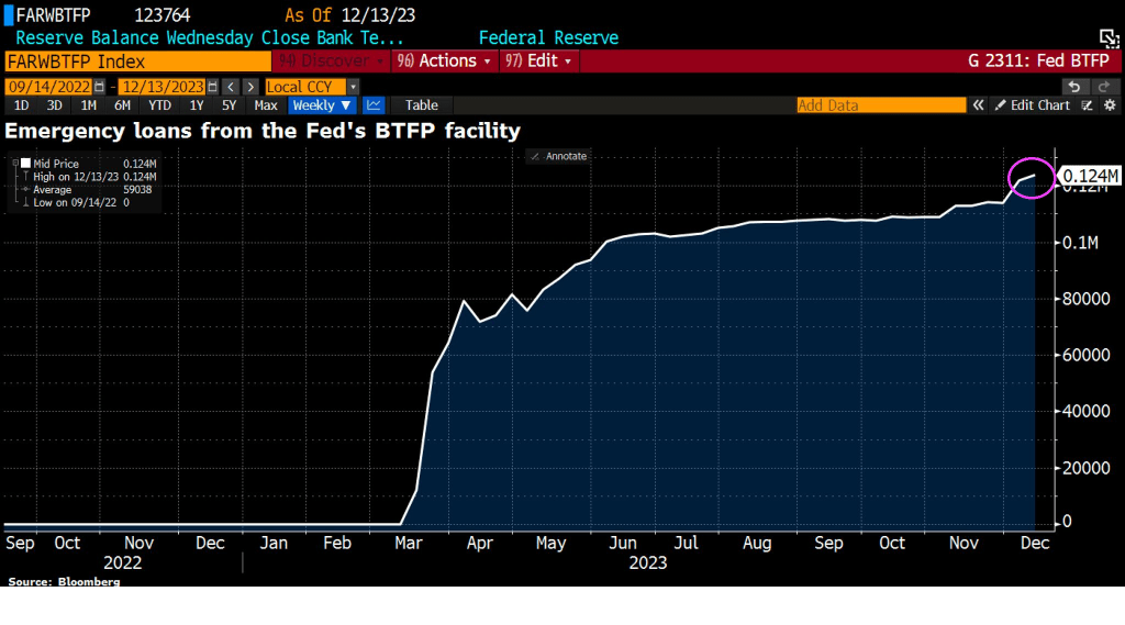 First, let’s begin with banks to illustrate the worsening condition of the economy. Emergency loans from The Fed’s Bank Term Funding Program (BTFP) is on the rise, signaling perceived trouble in the economy.