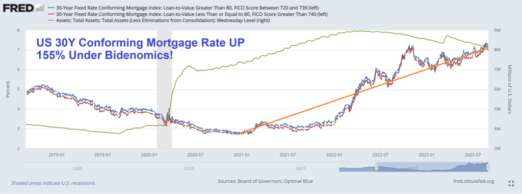 Despite not backing off the assets purchases by The Fed, conforming 30Y mortgage rate is still up 155% under Bidenomics.
