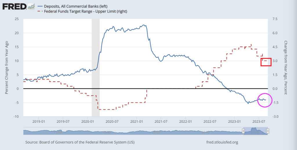 Bank deposits, a source of bank lending, are down -4% YoY as The Fed tightens rates.