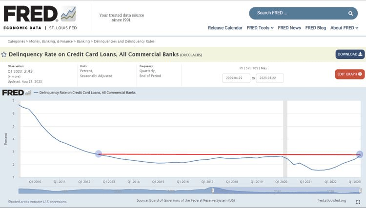 Credit Card Delinquency Rate across all commercial banks hit 2.77% in the 2nd quarter, the highest level in more than a decade.