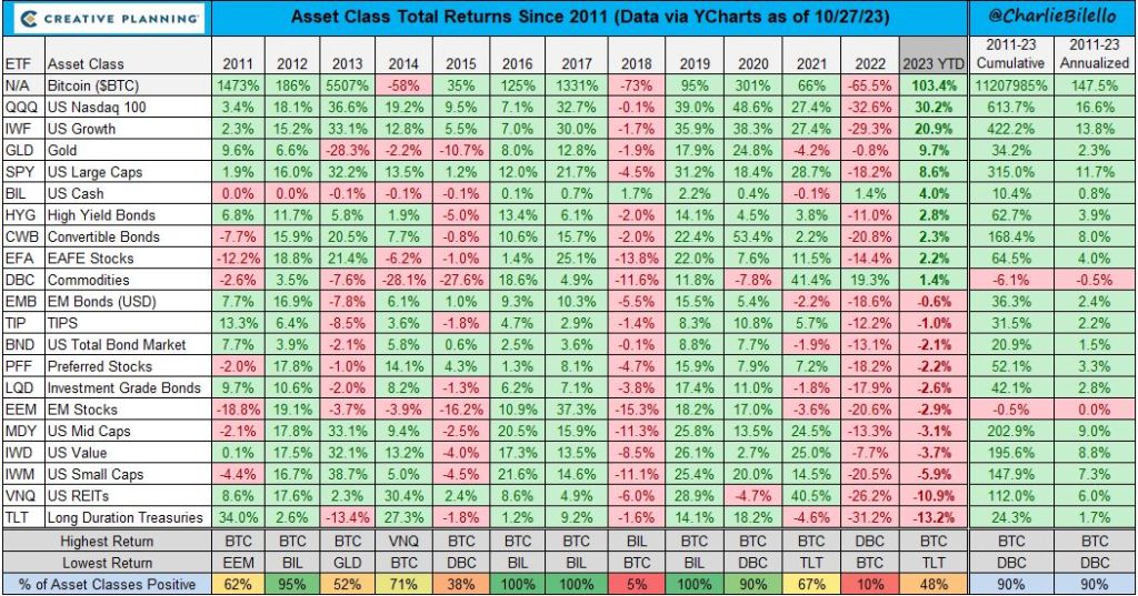 2022 was a bad year for investments under Bidenomics. 2023 year to date is showing huge gains for Bitcoin, the NASDAQ and gold. Bringing up the rear are long duration Treasuries and REITs (real estate investment trusts), both earning negative returns thus far of less than -10%.