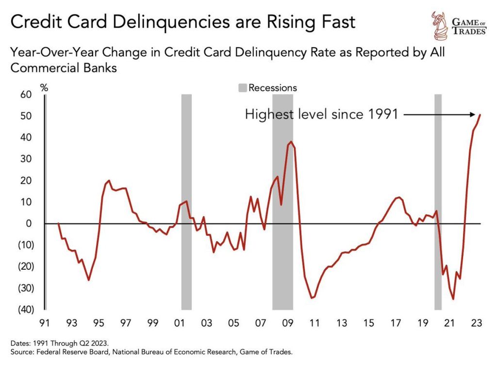 Meanwhile, stressed households are seeing credit card delinquencies at the highest level since 1991.
