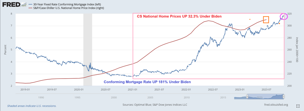 Speaking of over, under, sideways, down under Bidenomics, mortgage rates are up 181% and home prices are up 32.3% under Biden.