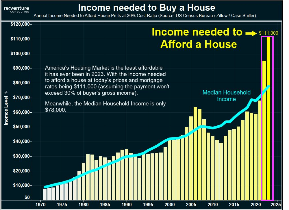 Evidence that Bidenomics is not working and destructive? Try the surging income needed to buy a house under Biden. Home prices are rising faster than median household income. As in $111,000 income needed to buy a house, while median household income is only $78,000. So, housing is simply unaffordable under Bidenomics. The Biden era is outlined in pink.