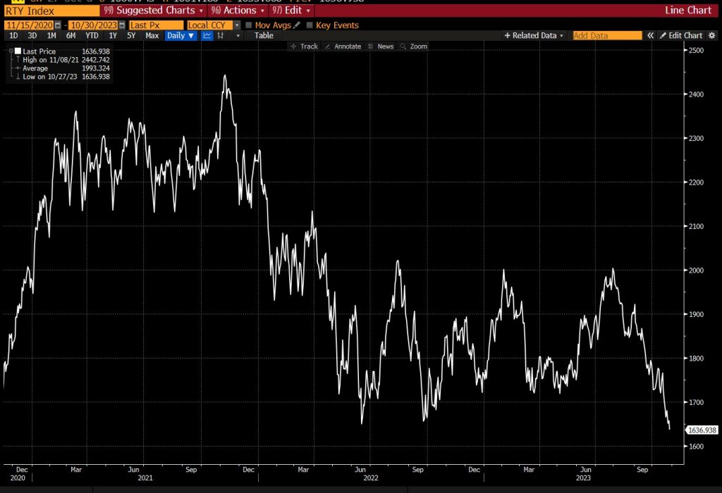 The benchmark small cap index, the Russell 2000, has hit the lowest levels since November 2020, when the world was still without a vaccine and shut down from Covid. And before Biden’s/Congress wild spending spree and debt volume explosion creating massive inflation causing The Fed to hike rates.