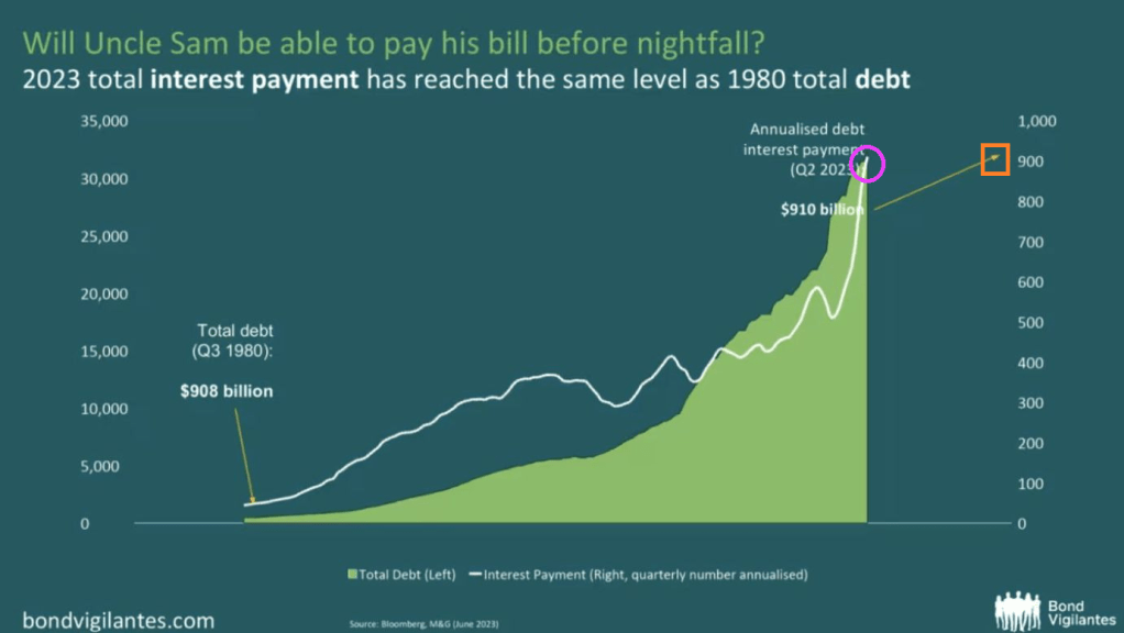 And thanks to Uncle Spam (given how Uncle Sam is destroying the middle class it is now Uncle Spam), 2023 interest payments are the same as the total debt from 1980! Spam, which the Federal government has devolved into, is very high in fat, calories and sodium and low in important nutrients, such as protein, vitamins and minerals.