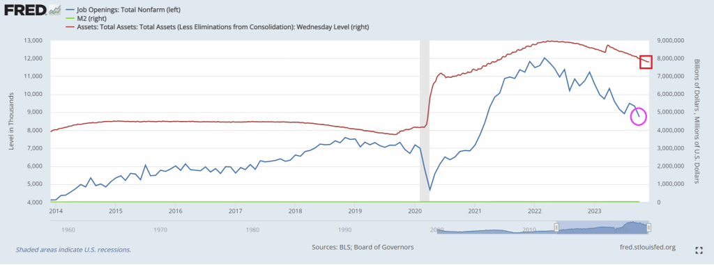 But if we look at job openings plotted against The Fed’s balance sheet, we see an ugly relationship. Job openings rose under Biden in 2021 and 2022 … as The Fed continued buying assets. Then, like magic, The Fed started shrinking their balance sheet and US job openings began to shrink.