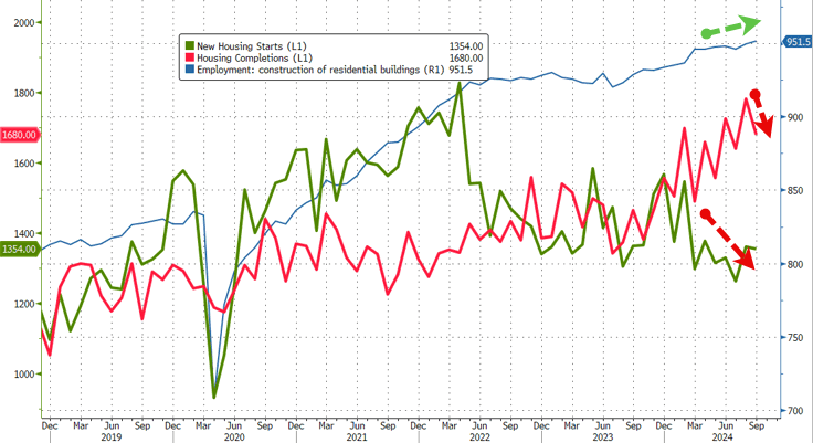 Housing Completions also dropped (but the BLS thinks construction jobs continue to rise non-stop)…