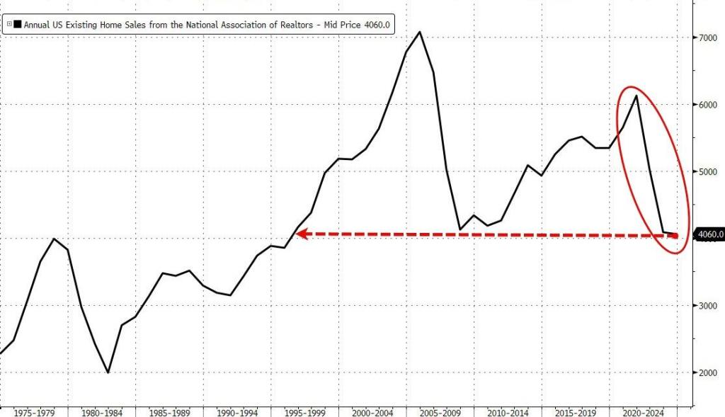 US Existing Home Sales rose for the third straight month in December (longest streak since late 2021), rising 2.2% MoM and up 9.3% YoY – the best annual shift since June 2021. However, despite the last rebound, for all of 2024, sales reached the lowest since 1995, when the US had about 70 million fewer people.