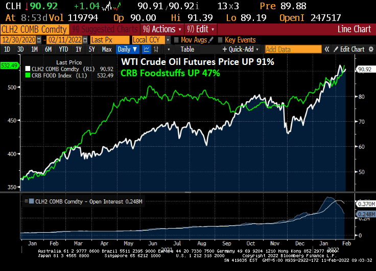 Well, it has been a cringe-worthy year+ under President Biden. West Texas Intermediate Crude futures price is up 91% and the Commodity Research Bureau Foodstuffs index is up 47%. Talk about Biden’s energy folicies being passed through to American households in the form of higher food costs and energy prices!