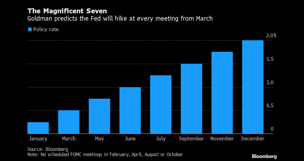 Goldman Sachs sees 7 rate hikes in 2022, culminating in an eventual 2% rate in December.