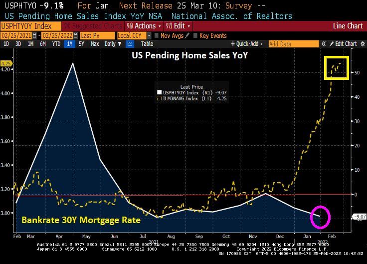 US pending home sales fell -9.07% YoY as mortgage interest rates began rising.