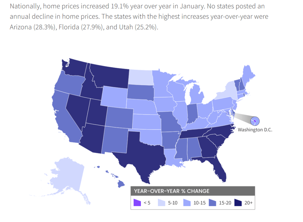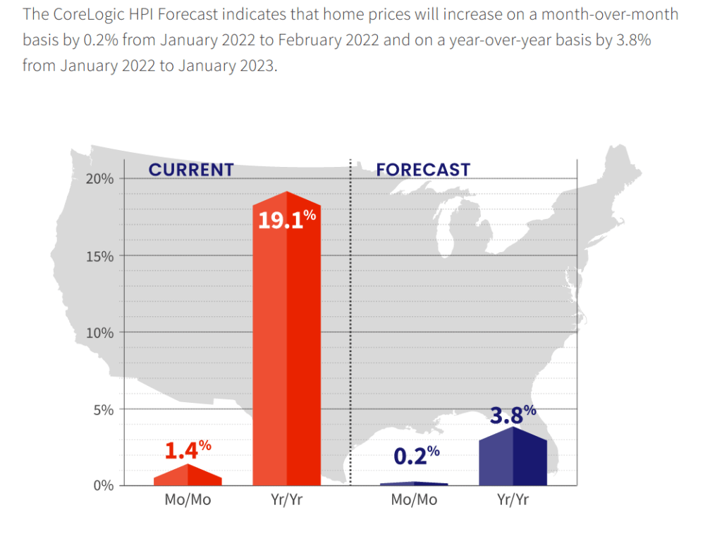 Home prices nationwide, including distressed sales, increased year over year by 19.1% in January 2022 compared with January 2021. On a month-over-month basis, home prices increased by 1.4% in January 2022 compared with December 2021 (revisions with public records data are standard, and to ensure accuracy, CoreLogic incorporates the newly released public data to provide updated results).