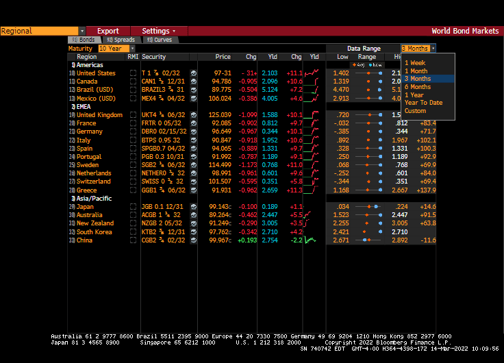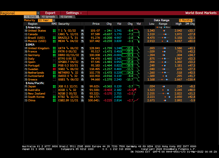 Europe. Middle East and Africa (EMEA) sovereign yields are all down over 10 basis points averaging around -15 bps.