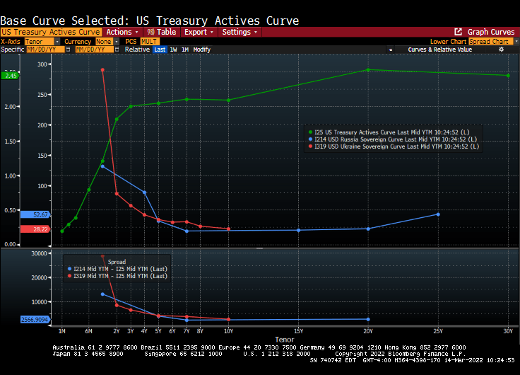 The US Treasury actives curve remains steeply upward sloping while both the Russian and Ukraine sovereign curves are steeply inverted and crashing.