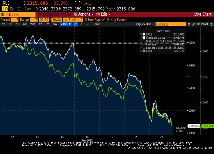 The US Treasury total return index (white line) has gotten crushed with The Fed’s signals of rate hikes and quantitative tightening (QT). Call it “White Line Fever.” The commodity total return index (blue line) has surged as The Fed’s expected rate hikes have risen from 3 to 9.4 in 2022.