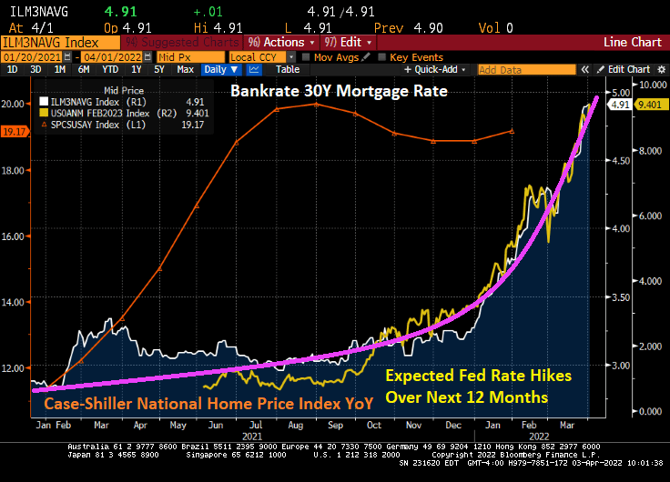 Is The Fed causing a Great Reset in housing? In 2022, we see the surge in Fed rate hike expectations leading the 30-year mortgage rate to be nearly 5%. The last Case-Shiller home price index was for January and it was still raging at 19.17% YoY growth. Let’s see if The Fed’s QT will slow down home price growth. But home prices are growing at 4x 30-year mortgage rates.
