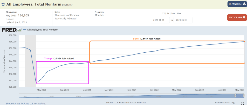 Actually, the US economy added 12.53 million jobs after April 2020 (Trump) while Bidenomics created took 2 1/2 years to add 12.56 million jobs. So, Biden took over twice as long to create jobs after Covid than it did under Trump. Simply opening the economy and schools produced that magical claim by Biden. And the National Teacher’s Union and Randi Weingarten worked with Fauci to orchestrate shutting down schools. Blaming Trump for local governments shutting down the economy is pure bunk.