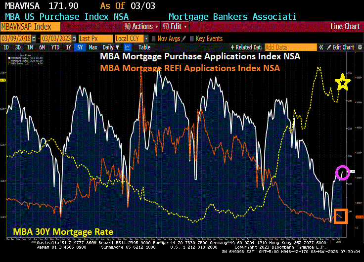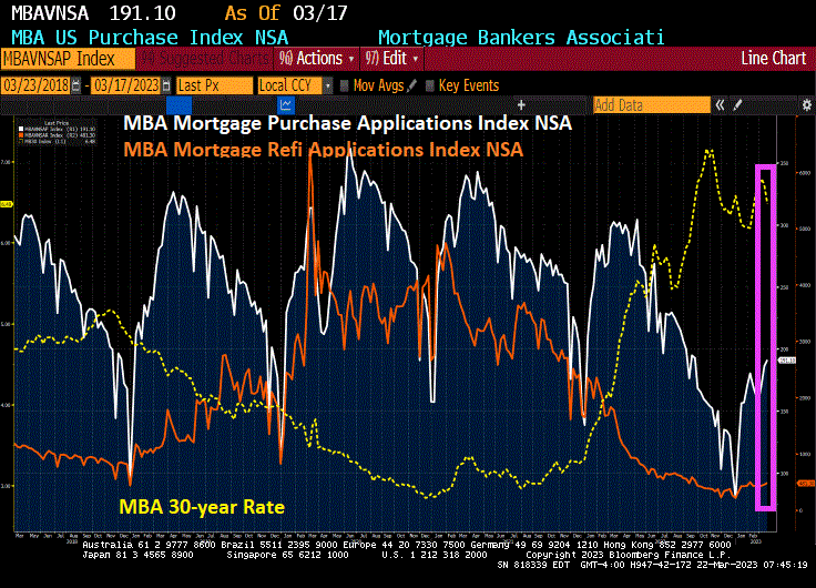 Well, the regional banking crisis has one positive outcome: mortgage rates dropped -46 basis points since last week. The result? Mortgage demand increased 2.9 percent week-over-week (WoW). Although I don’t recommend banking incompetence by bank management and “regulators” as a strategy to increase mortgage demand.