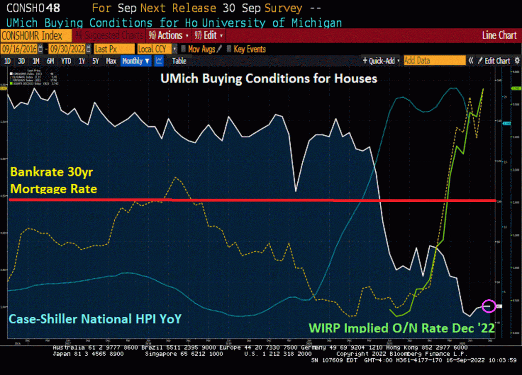 As The Fed tightens, the 30-year mortgage rate has risen to 14 year highs. And home prices are still hot, hot, hot (though slowing). But consumer sentiment for housing remains in the doldrums (UMich Buying Conditions For Houses).