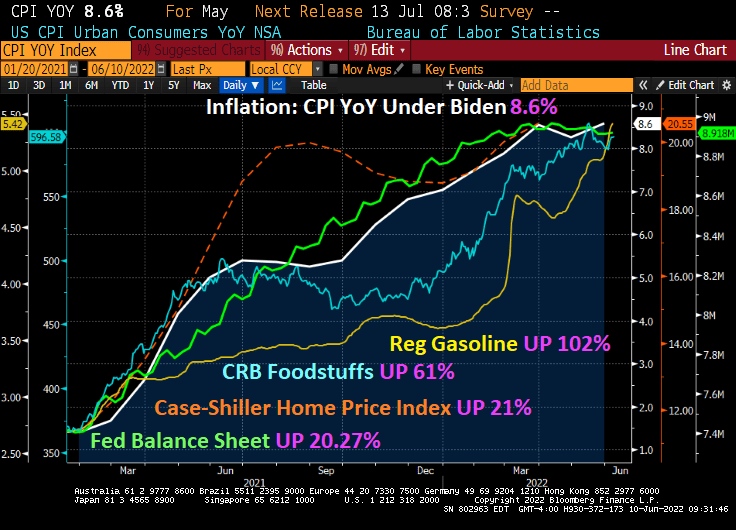 Under Biden’s leadership in cooperation with eternal Fed stimulus (until now), inflation started at 1.4% YoY and has increased to 8.6% YoY. The Fed’s balance sheet has increased by 20.27% (more monetary Stimulypto!), Case-Shiller home prices started at 10.44% YoY and has now doubled to 20.55% YoY. Regular gasoline started at $2.57 and is now at $5.42, up 102%. Food is up 61%.