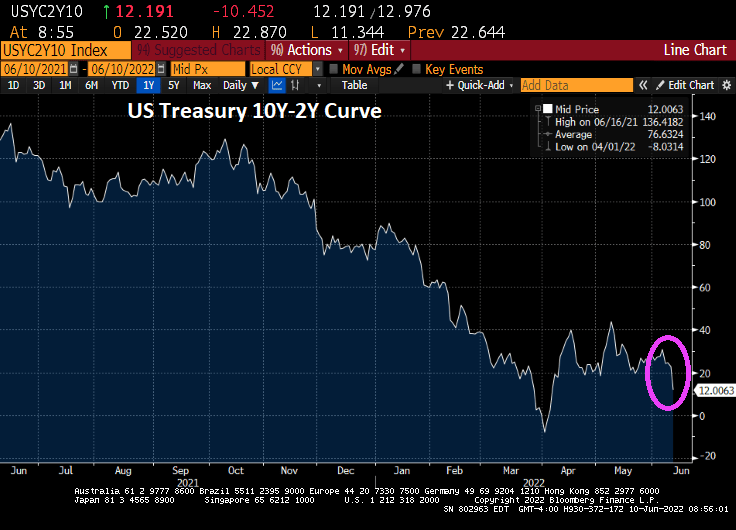 On the hotter than expected inflation news, the US Treasury 10Y-2Y curve flattened to 12 bps.