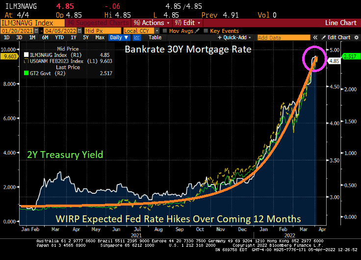 While Bankrate’s 30Y mortgage rate is down slightly today, the surge in the 10Y and 2Y Treasury yields could push mortgage rates above 5% by tomorrow,