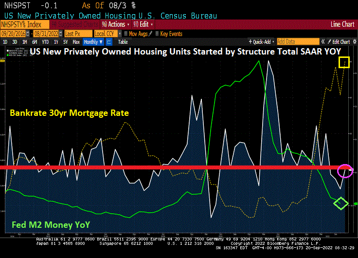The US is short on housing stock and remains short in August. While housing starts in August seems fantastic (12.8% MoM), the YoY growth in housing supply is down -0.1% as mortgage rates soar and The Fed removes monetary stimulus.
