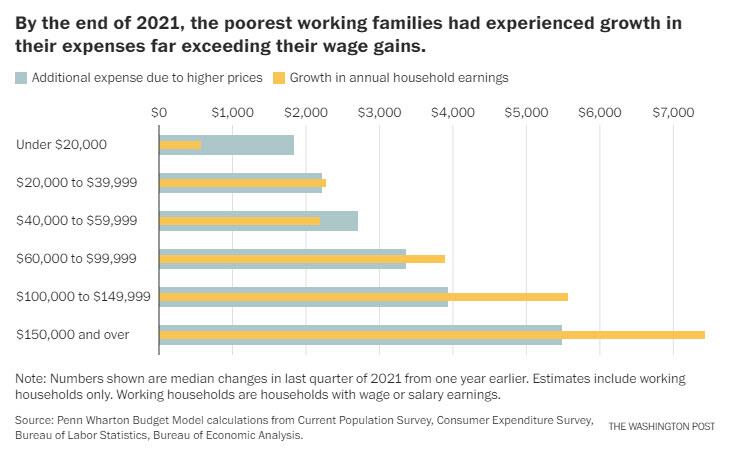 Yes, despite what government talking heads say, Federal stimulus increases demand for goods, the supply is generally slow to respond resulting in rising prices. Then government policies driving up energy prices also leads to highers prices. Throw in Federal Reserve monetary stimulypto and we have this chart from hell from Penn-Wharton. The chart shows that households earning less that $60,000 experience higher expenses due to rising prices than their gain in earnings.