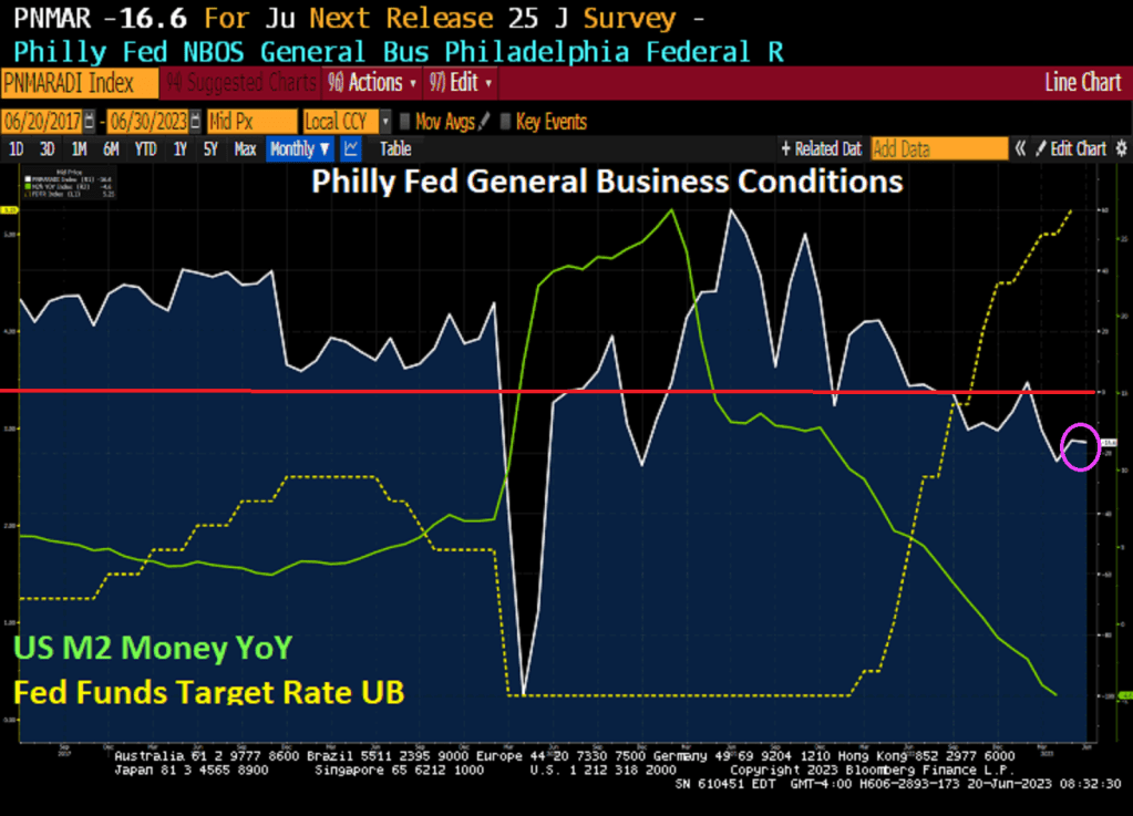 Now we have more evidence of an impending recession with the Philly Fed General Business Conditions index falling to -16.6 in June as Green Man (M2 Money growth) stalls.