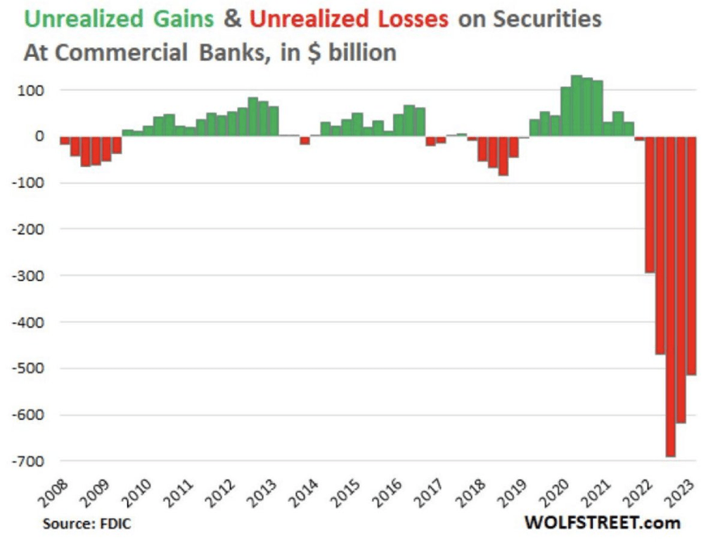 A March academic study titled “Monetary Tightening and U.S. Bank Fragility in 2023” stated that the market value of assets held by U.S. banks is $2.2 trillion lower than what is reported in terms of their book value. This represents an average 10 percent decline in the market value of assets across the U.S. banking industry, and much of this decline came from commercial real estate loans.