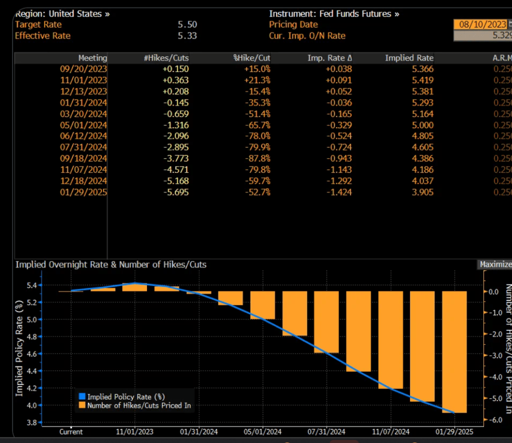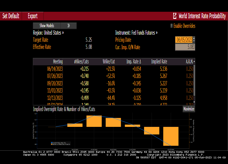 As of this AM, The Fed Funds Futures market is pricing in a chance of continued rate hikes by The Fed, but mostly we are at 5.25% at least until November when rates are forecast to begin declining.